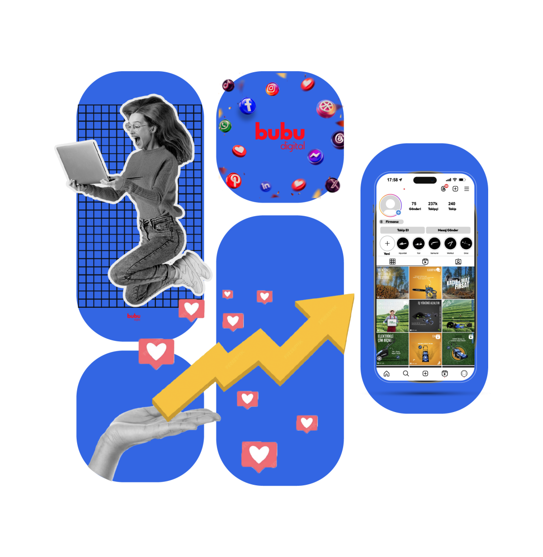 Bubu Digital olarak sosyal medya hesaplarınızı yalnızca “paylaşım yapılan alanlar” olmaktan çıkarıp, düzenli büyüyen ve satışa katkı sağlayan güçlü bir iletişim kanalına dönüştürüyorum.